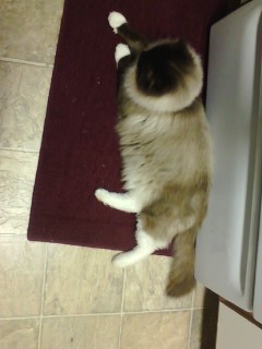 It's hard to tell, but he is actually on his back and cradled in my arm like a baby.  He would prefer to stay like this all day.