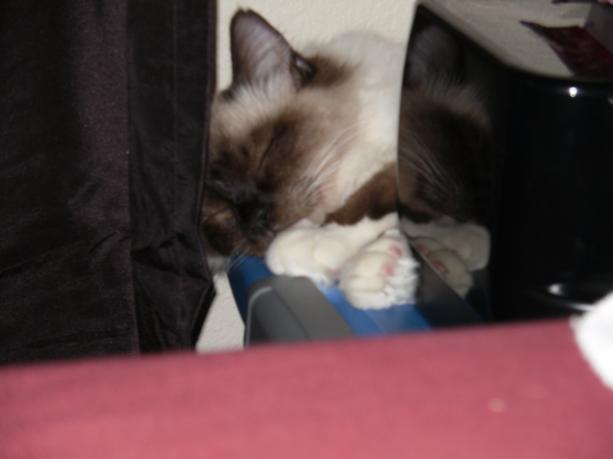 Looks like he got drunk on greek yogurt!  Not long after this picture was taken he poured himself off of the desk and didn't wake until he landed on the chair.  Must have been a good dream!