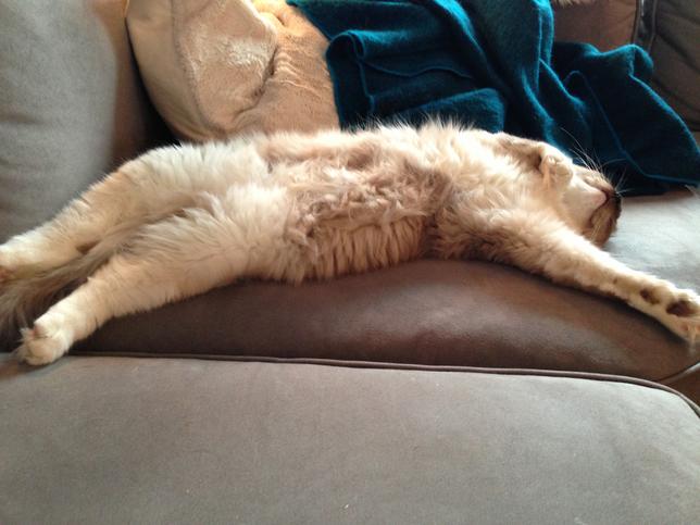 Quinn is a great kitten full of personality(and himself). He had picked up on fetching his little feather toy...brings it to me and wants it thrown and repeat, and repeat. He now weights almost 13 pounds (at 8 1/2 mos), he coat is darkening up, and never wants to anywhere but around us.