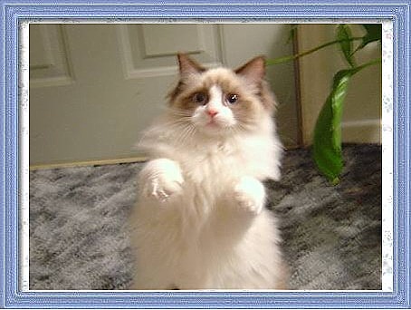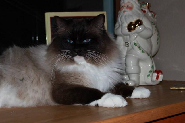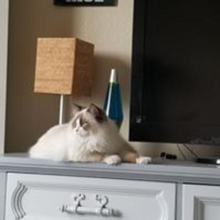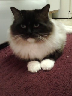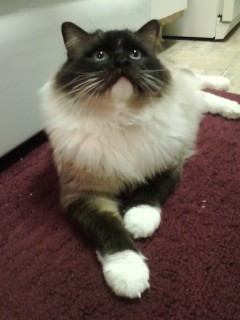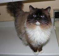 He is a seal point mitted BIG "purr-bucket" full of in-your-face personality. His temperament is absolutely fantastic which is passes to his babies. This talkative boy is super floppy and easy going, nothing phases him. He can't even be bothered to move for the vacuum if he is lying on the carpet, he figures you can just go around him. Poe is fascinated with water. He is all boy and acts like a dog in a cat suit. He is happy as long as he is in the same room as the mama of the house! He is a once in a lifetime pet. And he's mine all mine!!